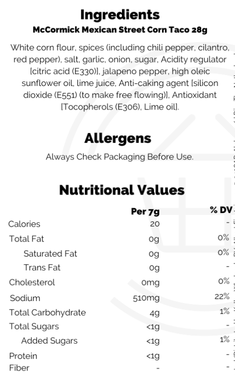 McCormick Mexican Street Corn Taco Seasoning 28g brings the bold, savory-sweet flavors of Mexican street corn to your taco night. This expertly blended seasoning combines chili pepper, garlic, paprika, and a hint of lime to create a rich, creamy, and slightly smoky taste that pairs perfectly with grilled corn, chicken, beef, or plant-based fillings. Inspired by the popular elote flavors, it’s a fun and flavorful twist on traditional taco seasoning. Conveniently packed in a 28g sachet, it’s ideal for quick, easy, and delicious meals with authentic Mexican flair.